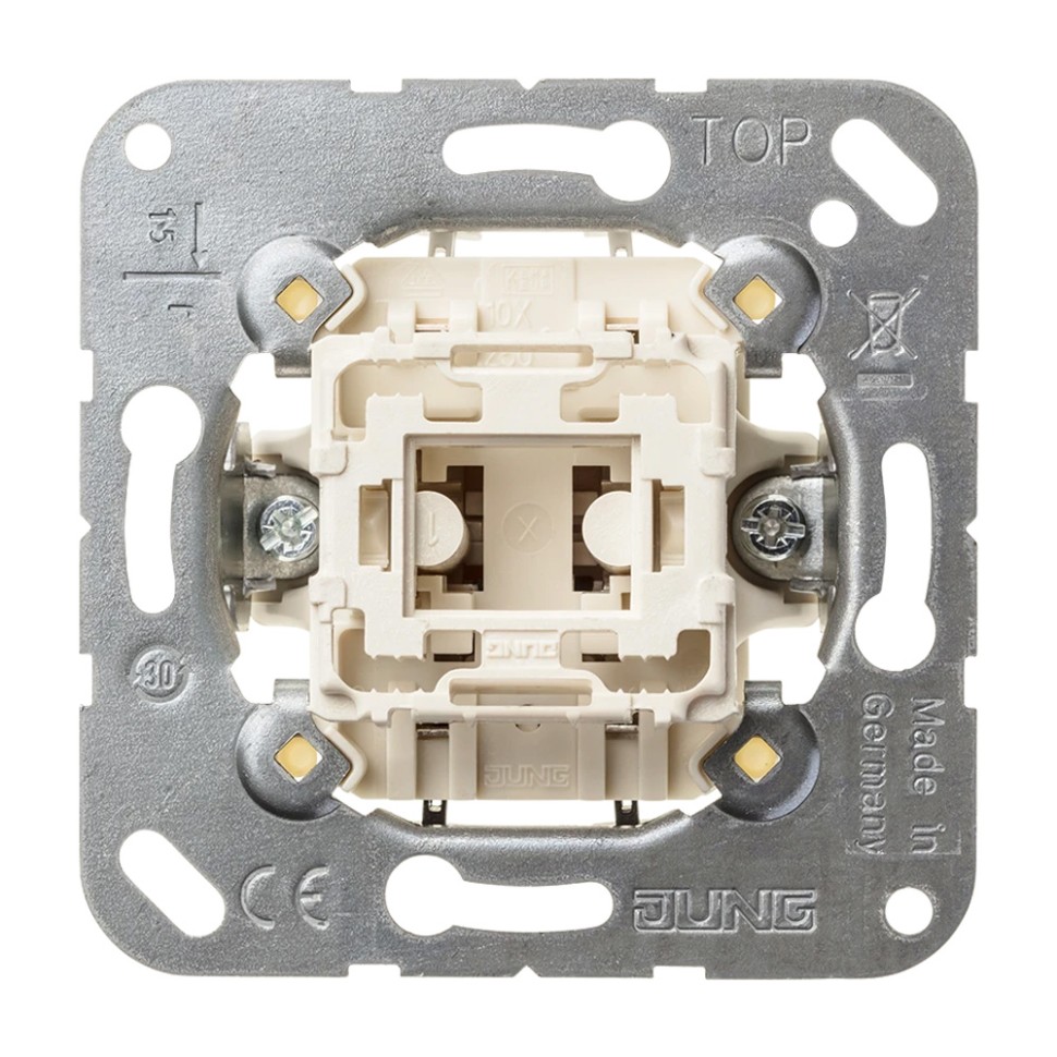 Описание507U Jung Балансирный перекрестный переключатель 10 A / 250 B, пружинные зажимы; не подходит к клавишам серии EP; универсальные встраиваемые механизмы