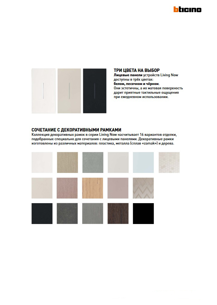 Living Now – это новая коллекция, которая объединяет лучший дизайн и интеллектуальные технологии BTicino. Всё это сочетается с традиционной простотой монтажа.