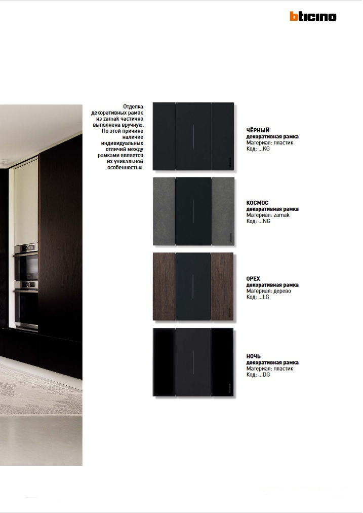Коллекция декоративных рамок в серии Living Now насчитывает 16 вариантов отделки, подобранных специально для сочетания с лицевыми панелями. Декоративные рамки изготовлены из различных материалов: пластика, металла (сплав «zamak») и дерева.