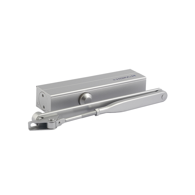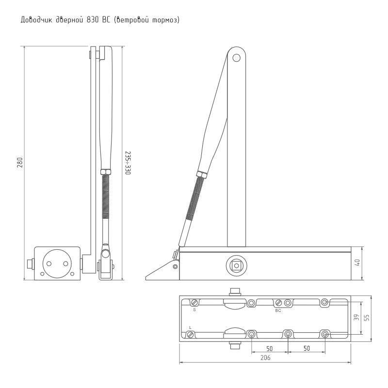 Дверной доводчик 830 BC (Back Check) с ветровым тормозом и быстроразъемным рычагом коленного типа, рассчитанный на вес двери от 40 до 150 кг.